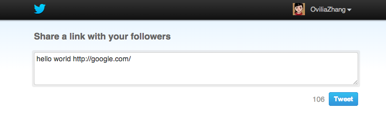 SNS usually provides sharing service that takes parameters in URL and then generates a sharing post. Take Twitter for example, we can enter the following address in the address bar, https://twitter.com/intent/tweet?text=hello+world&url=http://google.com. Since I’m logged in as @OviliaZhang, I can see something like this.