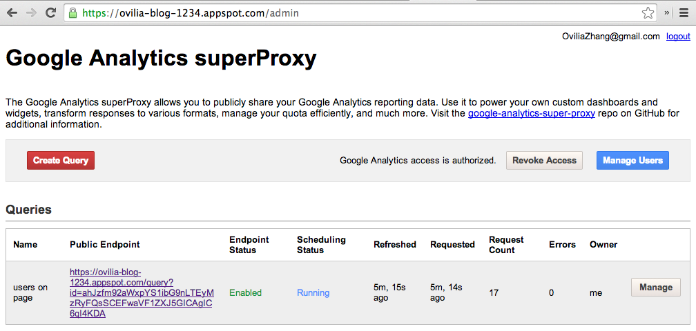 It provides Java, Python, PHP, and JavaScript API. Since I host my blog using Jekyll on GitHub, it seems JavaScript is my only option. But in fact, Core Reporting API seems to be designed for scenarios like management dashboard, which needs users to authenticate using OAuth 2.0. Apparently, I can’t make visitors to my blog authenticate it with my own Google account for Analytics!