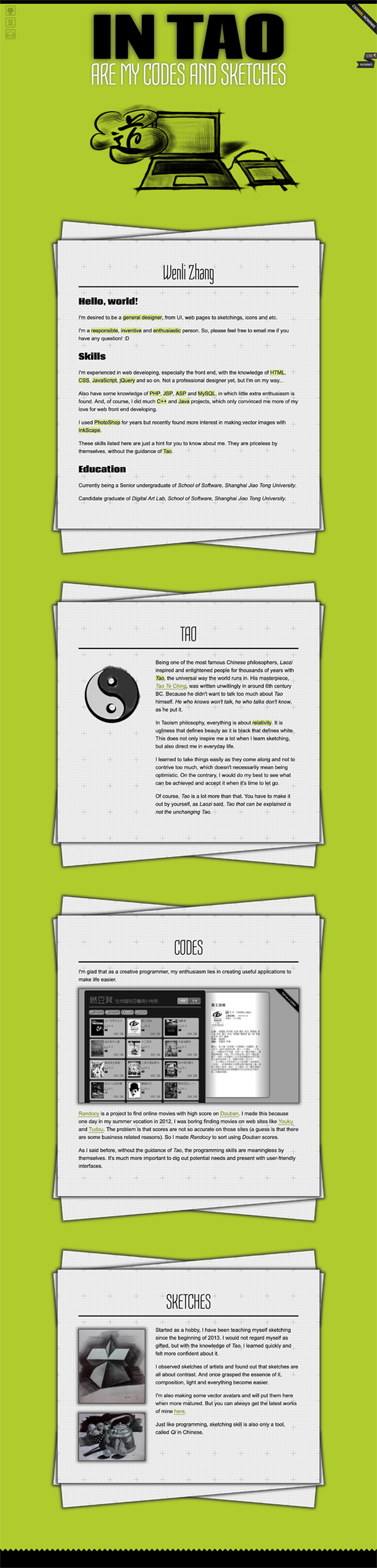 那时候我特别喜欢老子道德经之类的东西,于是这个网站的设计,也很大程度上来源于此。当然我现在去看的时候我会觉得有很多地方的设计非常的粗糙,也能提出一些简单却非常行之有效的方法对其进行改善,但是当时的我其实也是对自己的作品比较满意的,还提交了一个css的网站比赛……还拿了一个提名奖……