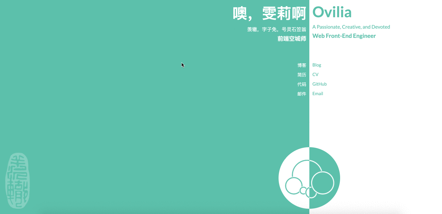 2015 版的个人网站主要的设计思路是通过纯 CSS 的方式实现一个动态的样式转换,如果鼠标在左侧就会高亮左侧,如果鼠标在右侧就会高亮右侧。