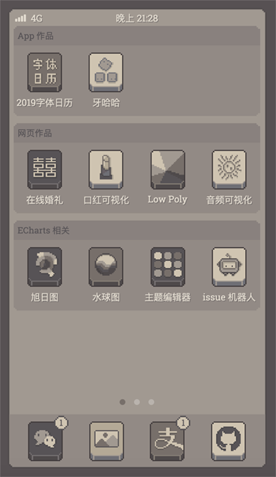 于是就开始一边设计,一边实现。最开始的想法是,模拟 iOS 手机的界面。我已经实现到了还原度比较高的效果,但是整体来讲并没有特别让人眼前一亮的地方——因为它毕竟太像我们熟悉的手机系统了。于是又经过了一段时间,我想到了,用当时比较感兴趣的像素风去实现手机系统。