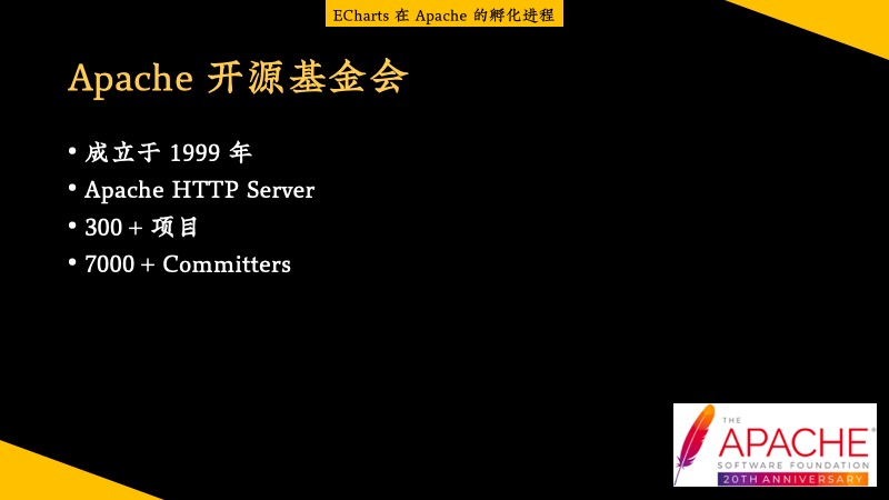 Apache 开源基金会成立于 1999 年,最初的时候就是那个我们很熟悉的 Apache HTTP Server 的项目。至今已经发展了 300 多个项目(含孵化项目),拥有超过 7000 名 Committer。