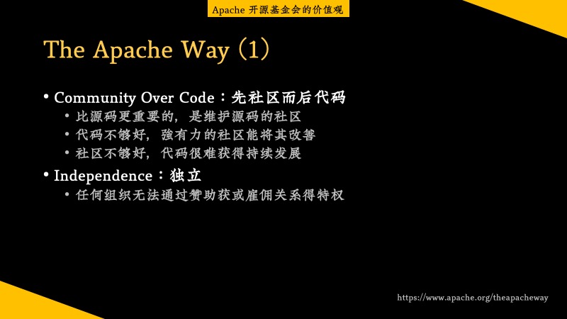 其中最重要的一条是 Community Over Code。我自己把它翻译为:先社区而后代码。