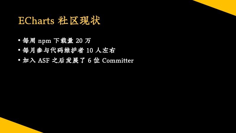 刚才提到,ECharts 项目每周 npm 下载量 20 万,但是真正参与代码维护的,每个月只有十来个人。这个比例也使得我们现在急需吸纳更多社区贡献者,所以现在加入我们就是最好的时刻!